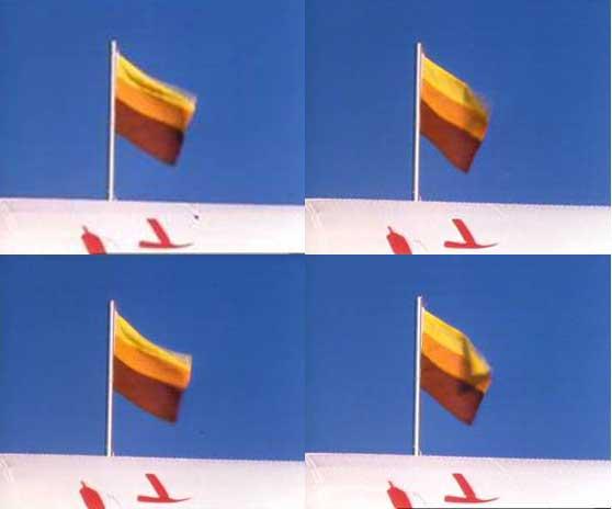 In this screen capture here, the flag that is shown flying above a jet. It appears to be a horizontal triband of yellow at the top, orange in the middle and brown at the base. I do think the bottom stripe is brown rather than red as some of your correspondents have suggested but a somewhat unlikely African colour scheme I think!