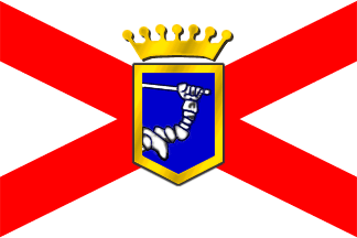 colour, being a red saltire on white with the coat of arms