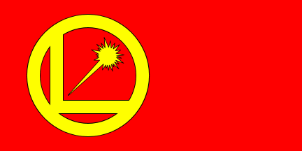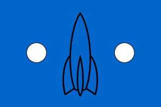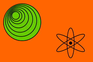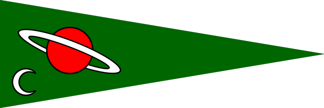 Green pennant with white-ringed red planet.