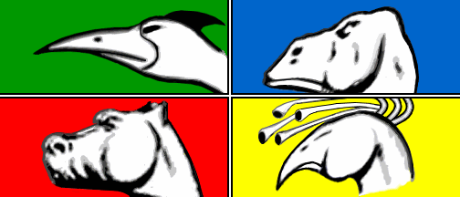 head of a different cranky-looking animal in profile in each one –