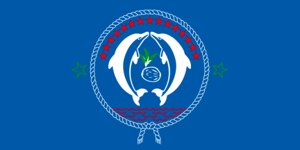 A blue flag with a central badge consisting of an white-outlined tied rope, two leaping dolphins arced around a sprouting coconut, an arc of 17 red stars above the dolphins, red waves below, and outside the rope, two green-edged blue stars.