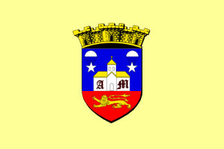 The flag of Sainte-Mère-Eglise is pale yellow with the municipal coat of arms placed in the middle of the flag.