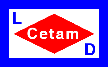 The houseflag of LD Cetam is white with a blue border, the blue letters "L" and "D" in the upper left and lower right white field, respectively, and a red diamond charged with "Cetam" in white. This flag is derived from the houseflag of LDA, in which the red diamond is charged with a yellow wheat spike.
