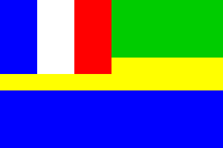 (The) upper horizontal stripe (shall be) of a width equal to 5/12 of the total width (of the) flag, (and is) divided into two equal parts. Against the flag pole - (the) colours of the (French) Community (of Nations), at the fly - light Irish green.