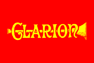 logo, the word "CLARION" in a Belle Epoque-type font over a long trumpet,