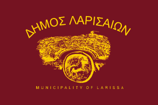The flag of Larissa (photo, photo; Kokkonis website) is marroon / dark red with the municipal emblem and the name of the municipality in Greek and in English.