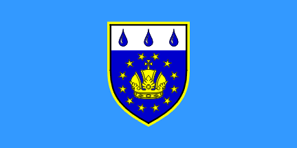 The flag is blue with the coat of arms, bordered yellow, in the middle.