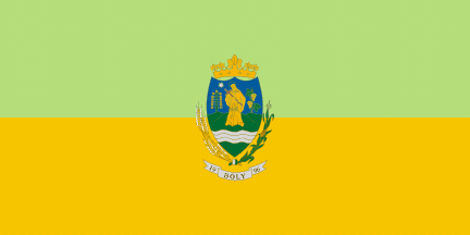 Flag is pale green and yellow, with Coat of Arms in the center,