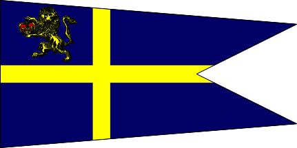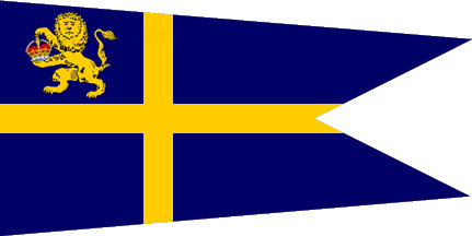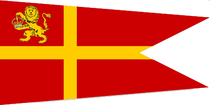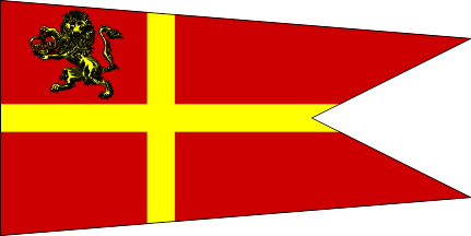 is a red swallow-tailed broad pennant with a yellow cross and badge, a golden