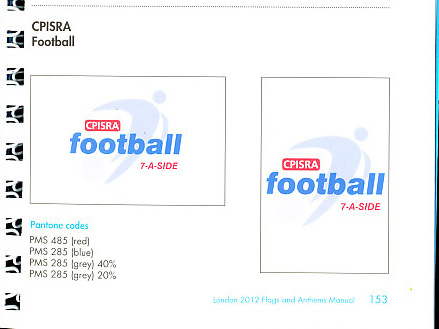 For CPISRA - 7-a-side football: PMS 485 red, PMS 285 blue, PMS 285 grey 40%, and