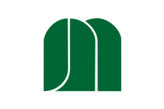white flag has a green village emblem in the center. The village emblem is a