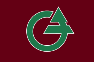 maroon flag has a green town emblem with a white fimbriation. The town emblem is