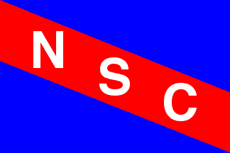 Blue flag with a red stripe per bend, charged with the letters N S C in white.