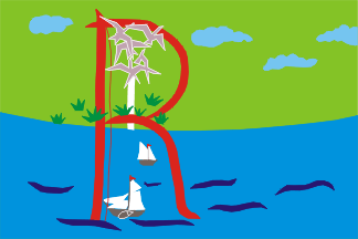 a red rope; in the center of the "R" is a white pole, topped by c. 5 grey