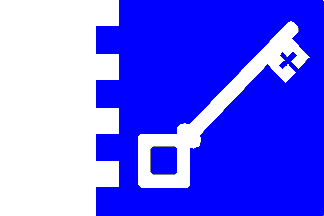 Flag: two stripes of white and blue proportioned 1:2, with an embattled