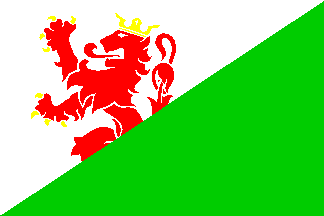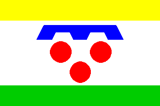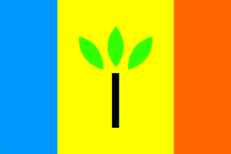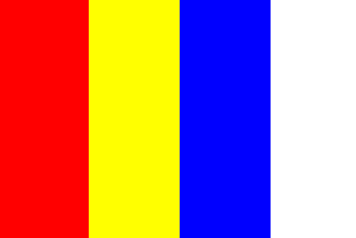 Flag: three vertical stripes blue - yellow - red, proportioned 1:2:1,