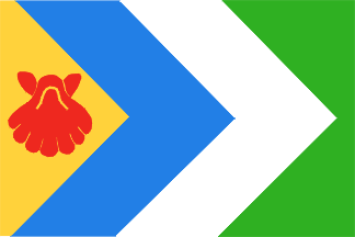 Flag: in four pieces piled from the hoist of yellow, blue, white and green, so that the top and bottom of the flag are divided in four parts, of which the lengths are proportioned 1:7:7:9, and the apex of the white pile is at 23/24 flaglength; on yellow an eared St. James shell.