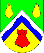 Arms: per chevron parti per fess vert and or with over the dividing line a chevron, along its longest axis parti per fess argent and azure, the chevron in chief with two pears or and in base an eared Saint James shell gules.