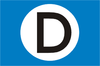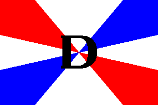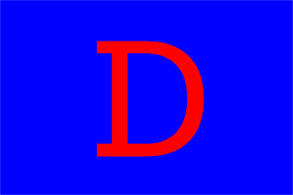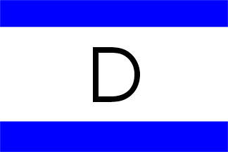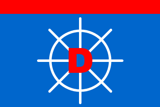 Company website, English version: An interesting section is ‘Trip reports’ (texts, photos) on current business of several ships: see left menu. (In one instance some boat people are rescued.) As we might expect the flagoid prominently shown on above pages is really the house flag: blue, a small red stripe on top and a white stylized steering wheel in the centre in front of which is placed a red initial ‘D’ (no serifs). National colours.