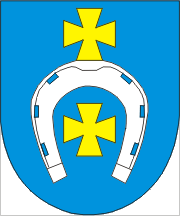 Coat of arms: azure a hoof-iron argent between two crosses formy or.