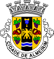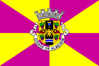 The coat of arms has a 5-towered mural crown (city rank), a scroll reading "CIDADE DE ALMEIRIM" and a very busy shield. This is vertically divided in 3 equal stripes of gold black and gold, the golden stripes are charged with purple grapes above and below a red horn (similar to the ones usually associated with post services), and the black stripe is charged with something in gold I can’t identify above, charged with a quina, a golden heraldic eagle in the centre and 3 wavy lines in silver-blue-silver below.