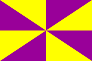 The flag is a gyronny of purple over dark yellow (in my sources; plain yellow most likely in the official text) with a typical coat of arms in the centre (city rank).