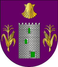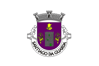 The arms are Purpure a square tower Argent masoned Sable with port and windows Vert between two corn cobs Or garnished Sable, in chief an scallop Or garnished Sable. Mural crown Argent with three visible towers (village rank) and white scroll reading in black upper case letters "SANTIAGO DA GUARDA".