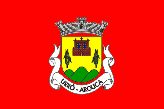 The arms are Or a bell two-arched belfry Gules masoned Sable with port and windows Or with two bells Azure and two corn cobs Or leaved Vert all set per chevron and issuant from the base a triple mount Vert. Mural crown Argent with three visible towers (village rank) and white scroll reading in black upper case letters "URRÔ - AROUCA".