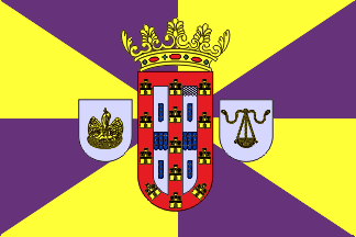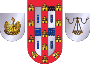 The usual representations of these arms, both as the queen’s and the city’s, are simplified to have only one single file of castles on the central part of the conjoined borders, the whole arms being discribed as Argent between two crosses of five escutcheons each charged with five plates per saltire a pale Gules charged with five castles Or and on a bordure Gules ten castles Or (etc.) with the aragon chief reduced to a fesslet couped fretty Sable and Argent.