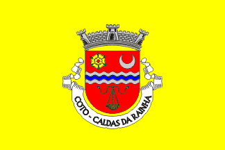 The arms are Gules on a fess wavy Argent a barrulet wavy Azure and in dexter chief a rose Or leved Vert and cored Gules and in sinister chief a crescent Argent pointing upwards and in pont a shrimpcatcher Or. Mural crown argent with three visible towers (commune rank) and white scroll reading in black upper case letters "Coto - Caldas da Rainha". Original blazon: