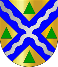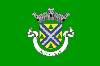 On a gold field 4 green triangles charged with a blue saltire and a saltire silver waves. 3 silver towers mural crown, white scroll with the lettering "ALTE-LOULÉ".
