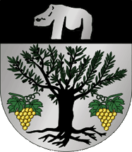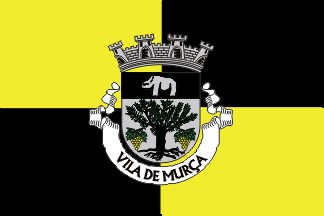 The arms are Argent an olive tree vert fruited, stalked and eradicated Sable between two bunches of grapes Or leavedVert, in chief Sable a representation of the “Murça sow” megalith Argent. Mural crown Argent with four visible towers (town rank) and white scroll reading in black upper case letters ""