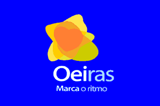 o ritmo" (meaning "Oeiras sets the pace") in blue sans serif letters. The logo flag is used as much as the official municipal flag in street ornamentation and other non official uses.
