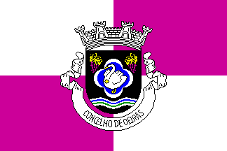 The coat of arms is Sable on a chain of four crescents, a so called lunelle, Argent hollowed azure (uma cadena de quatro cescentes de prata vazia de blau) flanked in chief by two bunches of grapes leaved Or and fruited Purpure, in base a bar wavy Argent charged with a barrulet Azure and a barrulet Vert, in the lunelle a swan Argent armed Or and charged with an 8-point star on its breast. Mural crown Argent with four visible towers (town rank) and white scroll reading in black upper case letters "VILA DE OEIRAS".