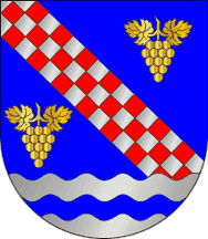 The arms are Azure a bend chequy of three orders Argent and Gules between two bunches of grapes Or and overall a base wavy Argent charged with a barrulet wavy Azure. Mural crown Argent with four visible towers (town rank) and white scroll reading in black upper case letters "SALZEDAS".