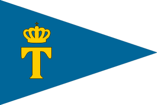 Blue swallow-tailed broad pennant with yellow lion rampant, crowned proper and holding white portcullis with chains.