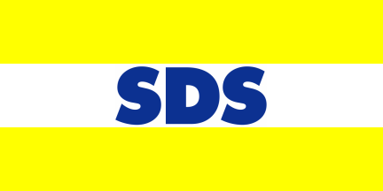 The flag, which is clearly based on the logotype, is horizontally divided yellow-white-yellow with blue party name abbreviation "SDS" in centre of the white field. The party has also used this flag before the name change in 2003. The flag must have been adopted at the 5th Congress of the party in 1999, because the party name abbreviation was changed then, without renaming of the party, from SDSS to SDS, which was used at the 6th Congress in and afterwards, but a similar flag must have been used before, because the earlier abbreviation was inscribed, in the same typeface as used nowadays, as the decoration for the 4th Congress in 1995.