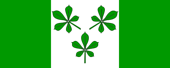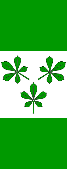 The flag is rectangular, in proportions 2:5, vertically divided in three fields, the first and third being green and the middle one square, of white colour. It contains three green wild chestnut leaves (2+1).