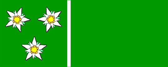 The flag is rectangular, in proportions 2:5, green with a thin white stripe dividing it in two parts, the field at hoist being square and containing the attribute from the coat of arms, three edelweiss flowers proper.