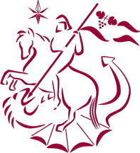 The emblem adopted as the coat of arms of Sveti Jurij v Slovenskih goricah is a red drawing of St. George slaying the dragon. The St. George's spear is topped with a flying flag with a bunch of grapes and two leaves and to the dexter is a six-pointed segmented star. The emblem has no background shield nor outline.