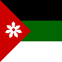 - a square flag with unequal horizontal black, green and white stripes, the green one being narrower and a red triangle along the hoist. A seven-pointed white star looking more like a seven-petaled flower is placed in the right point of the triangle.