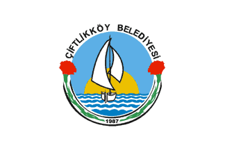 The flag of Çiftlikköy (photo) is white with the municipality's emblem in the middle. "Çİ,FTLİKKÖY BELEDİYESİ" means "Çiftlikköy Municipality".
