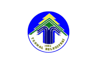 The flag of Termal (photo) is white with the municipality's emblem in the middle. "TERMAL BELEDİYESİ" means "Termal Municipality".