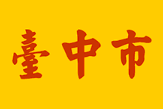 On yellow field are there three red Chinese characters "臺中市" ("T'ai Chung Shih" or "Tai Zhong Shi"), the name of the city.