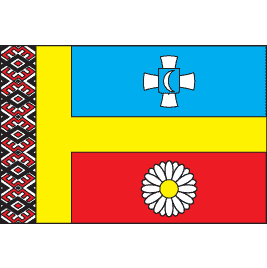 argent chief is gules-and-sable Ukrainian ornament. On azure tape