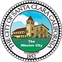 I found a short video showing the Santa Clara city flag waving [no longer available] and an image (small) of the city seal (shown above) at www.scu.edu/cas/environmentalstudies/ulistac/news/images/Citysealcolorsm.jpg.