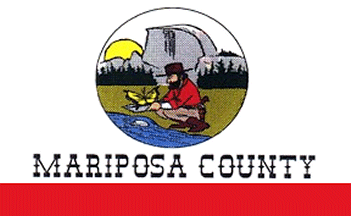 The probably flag of Mariposa County, as shown on this individual website, appears to display on a California-style flag (white over red stripe) an image of a gold prospector before a scene of Yosemite Halfdome.