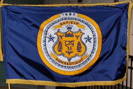 The flag of the Town of Enfield, Connecticut, is blue with town seal on it. Photo of the flag thanks to Debra McCarthy, Administrative Secretary, Town Manager's Office.