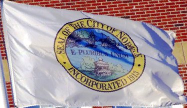 A white flag with the seal in the center.