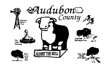 This emblem consists of the words "Audubon County", set in two lines with Zapf Chancery, the worth "County" smaller and offset to the fly, an outline map of Iowa with a square marking the county after the "n" of the county name and before the "A" a diamond square logo. Under this lettering a very large image of a bull flanked by captioned icons for local attractions. The bull, slightly stylized, is seen from front-left, with a clear 3D effect given by b/w coloring and angle, and it stands on a base block bearing the caption "Albert the bull", set in serif capitals. It is a representation of a local statue, erected by the beef industry: www.auduboncounty.com/docs/P1010146.jpg and www.auduboncounty.com/docs/Alber%20the%20Bull%209-08%20025.jpg at http://www.auduboncounty.com.
